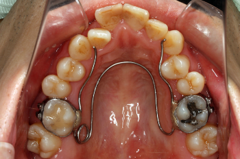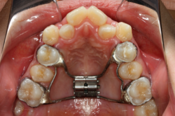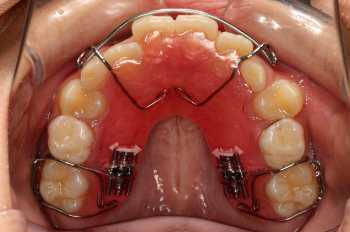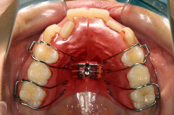 | 目的 | 「歯列全体を拡大する装置」です。上下歯列のどちらが小さい場合に、歯列全体を拡大するときに使う装置です。床矯正装置と違い取り外しができませんが、確実に拡大することができます。通常上顎に用いますが、下顎に適用することも可能です。デザイン次第で片側を拡大することもできます。この装置は、骨の土台ごと拡大するものではなく、あくまでも歯の配列を拡大するために使います。骨の土台ごと拡大するためには、「急速拡大装置」という特殊な装置が必要です。 |