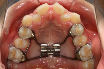 | 目的 | 上顎の骨を土台ごと側方に拡大する装置です。つまり上顎骨を大きくすると言うわけで、矯正力と言うよりも整形外科的力がかかる装置です。 上顎の骨は左右2枚の「上顎骨」という骨で構成されています。左右の骨は「縫合部」というものでジッパーのようにつながれていまして、大体18歳くらいまではこの縫合部の結合が弱いため、強い力をかけるとこの部分を分離することができます。矯正装置で分離させたところに新しい骨ができると、結果として骨が土台ごと大きくなると言う仕組みです。