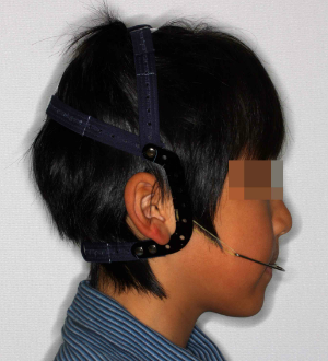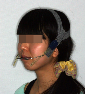 | 使用方法 | 上顎大臼歯に固定されたバンドの外側のブラケットにフェイスボウを差し込みます。フェイスボウを取り付けた後、ヘッドキャップをかぶり、横についているゴムをフェイスボウに引っかけます。基本的には、就寝時(1日約8〜10時間)に使用していただきます。 |