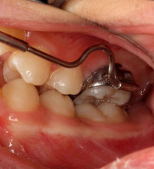 | 使用方法 | 歯の裏側に太めの針金を沿わせ、奥歯のバンドと一体化してあります。接着剤で固定しますので、ご自身では取り外しができません。拡大が必要な時期には先生が外して、調整後に接着剤で再度とめます。 |