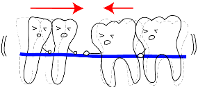 歯が綱引きをしている状態になります。これでは奥歯が前にすべってきてしまします。せっかく抜いたスペースで前歯を十分さげられなくなってしまいます。