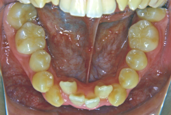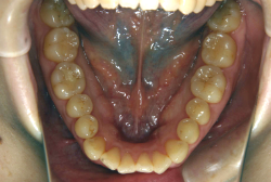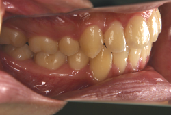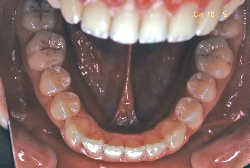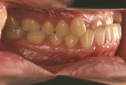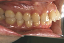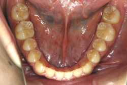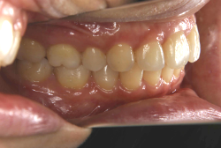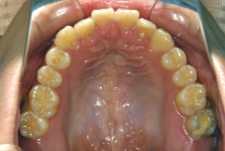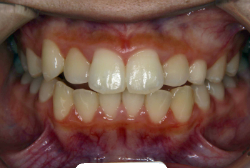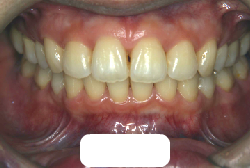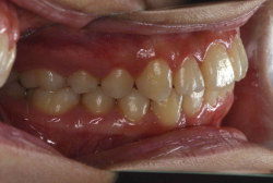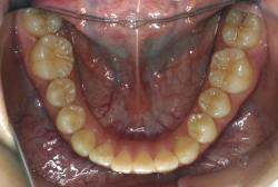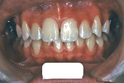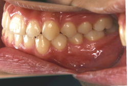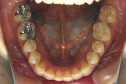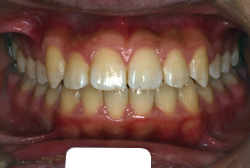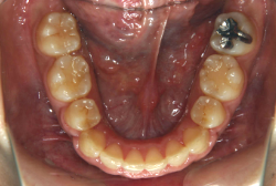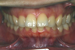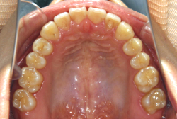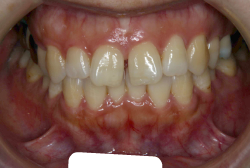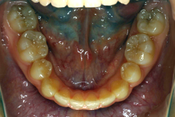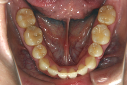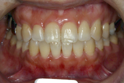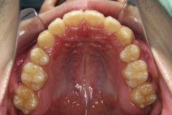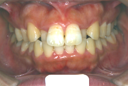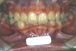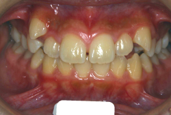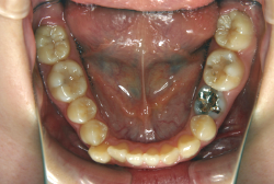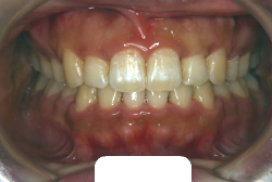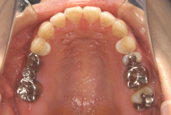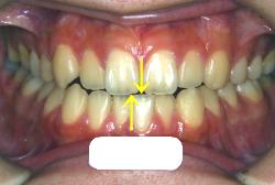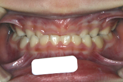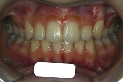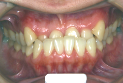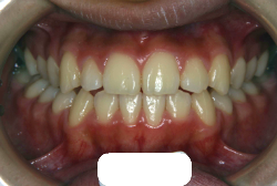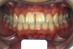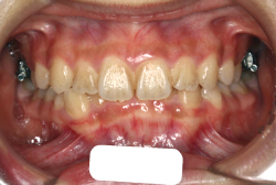 しかし、それ以上に問題なのは「前歯の噛み合い方が深すぎる」という症状で、初診の歯の正面写真を見ると下の前歯が全く見えません。こういう症状を矯正学では「過蓋咬合(かがいこうごう)」と言います。過蓋咬合を放置すると、将来的に顎関節に悪影響を与えるとされており、顎関節症の原因因子の一つです。また下の前歯の先端が、上の前歯の裏側の歯茎と強く接触するため、歯周病の原因にもなります。