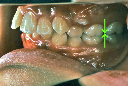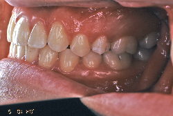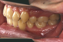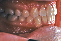 深く咬みすぎると、歯と歯で接触しながら閉じる距離と面積が広範囲にわたりすぎ、必要以上に歯をすり減らします。また顎の関節の自由な動きを歯と歯の接触関係が必要以上に規制してしまうため、顎の関節の動きがだんだん悪くなり、顎が開きにくくなったり、開いていく途中で大きな音が出たり、ひどいときには途中からそれ以上開けなくなったりします。こういう症状を"顎関節症"と言いますが、こういう状態にもっともなり易い咬み合わせです。顎関節症は、中年期以上にある日突然症状が発現することが多く、一度発症するとなかなか健康な状態にならない、消耗性の病気です。若くて抵抗力のあるうちはまだ良いのですが、過蓋咬合の人は歯がすり減りやすく、時間の経過とともに、ますます咬み合わせが深くなっていく傾向があり、早期発見・早期治療が望まれます。