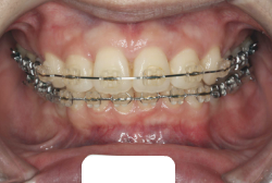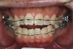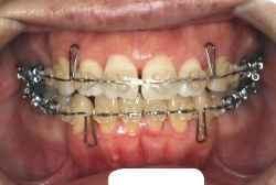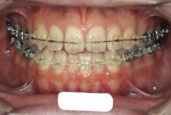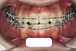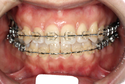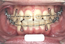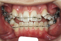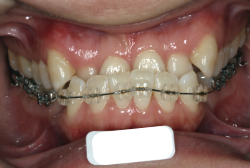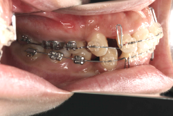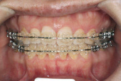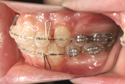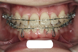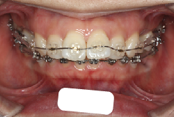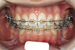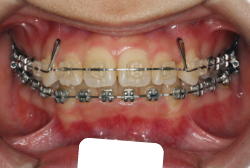 マルチブラケット装置は、装置装着時より数日から2週間程度強い不快感・疼痛が有りますが、本症例場合は治療後半で上顎前歯を内側へ牽引する際にも、強い疼痛が出ることがあります。