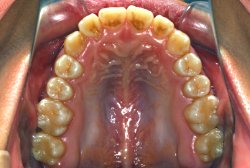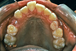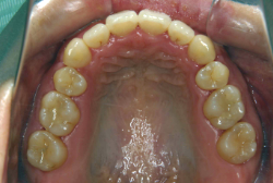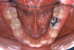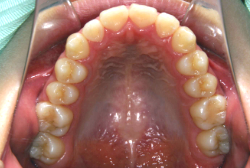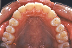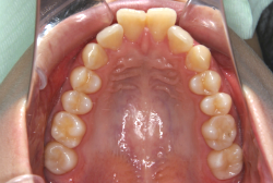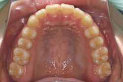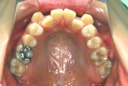 ネックバンドを1年半使用して、上顎大臼歯が十分後ろに下がったところで、裏側にリンガルアーチという固定のワイヤーを取り付けて、新しく生じた隙間が狭くならないよう「保隙(ほげき)」という処置をして、永久歯が生えそろうまで待機中の様子です。配列全体に隙間が生じているのがお分かりいただけると思います。これだけの隙間が確保できていれば、抜歯をしなくても、あとで上の前歯を内側に理想的な角度で引っ込めることができます。このように完全に永久歯列になる前に、十分な隙間が確保できるかどうかが、非抜歯で矯正できるかどうかの分かれ目になります。