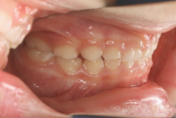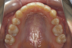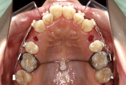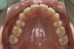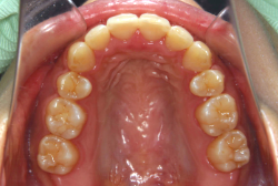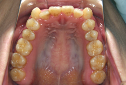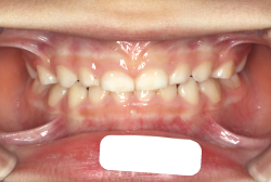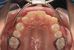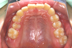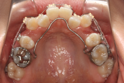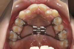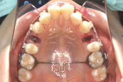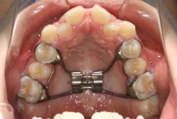 上顎に強い狭窄がある混合歯列期から18歳くらいまでの患者様に対して、本症例のように上顎急速拡大を行うことがあります。この装置は顎整形力に近い強力な力を口蓋に適用し、左右の口蓋骨を縫合部より強制的に乖離させることで上顎骨そのものを大きくする療法です。一時的に骨が離開するため顔面中央部に強い違和感、鼻腔奥の痛みを生じます。