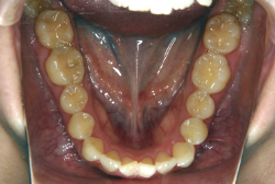 マルチブラケット装置は、装置装着時より数日から2週間程度強い不快感疼痛が有りますが、本症例場合は治療後半で上下顎前歯を内側へ牽引する際にも、強い疼痛が出ることがあります。