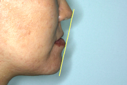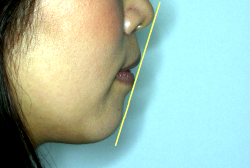 治療前後の口元の変化です。前歯の角度が大きく変わりました。治療前は外向きの前歯に押されて、口元がふくらみすぎの状態でした。黄色の線は鼻の頂上と顎の先端を結んだ線で、審美線と言います。審美線と唇はあまり接触しない方が良いと考えられています。矢印の部分がかなりラインオーバーしています。治療後はよりスマートで美しい横顔になりました。このように歯並びを直すと、唇の表情ひいてはお顔全体の表情にも良い変化が生まれます。