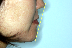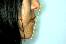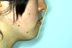 「出っ歯を治したい」という主訴で来院したケースです。診断の結果、「2級1類の上顎前突+軽度叢生」と判明しました。2級というのは、基本的に出っ歯の噛み合わせになっていることを言います。その中でも上の前歯が著しく外に反っているケースを、「1類」といいます。初診時の横向きの写真を見ると、それがはっきり分かります。上の前歯に押されて唇も膨らんで、審美線をかなりオーバーしています(審美線とは、鼻の先端と顎の先端を結ぶ線のことで、この線よりも唇は内側にある方が良いとされています)。