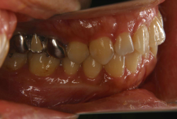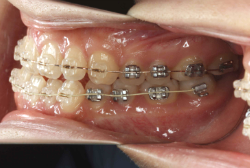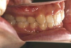 初診時と違い、上の奥歯がより後方に下がっていることが分かります。ただしこの段階では奥歯は後ろに下がりすぎの状態です。しかし次の段階でマルチブラケット法を始めると、上の奥歯は次第に前にズレて来ます。最終段階で正しい位置にするためには、この段階では余分に後ろに下がっている必要があります。