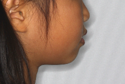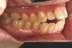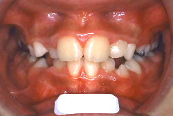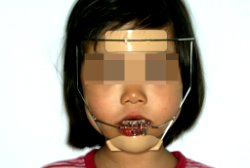上顎前方牽引装置で3歳から4歳にかけて治療した一例です。早ければ6ヶ月くらいで、上の歯が外側に来た状態で噛めるようになります。この装置は、上顎の発育を助け、下顎の発育を抑制する効果があるので、上顎骨の発育不良を伴うケースに最も効果的です。