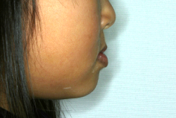 初診時の状態ですが、前歯の噛み合わせが逆転していて、下の前歯が外側に来て、上の前歯が裏側になっています。口元の様子ですが、前歯の重なり方が逆なので、唇の様子もそれを反映して、下唇が突出しています。反対咬合としてはかなり重症です。