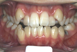 「上の前歯の凸凹」という主訴で来院したケースです。確かに上の左右二番目の歯が内側に引っ込んでいて、凸凹が目立つ状態です。歯並びの凸凹を矯正学では 叢生(そうせい)と言いまして、確かにご本人的にはそこが気になるのですが、矯正学的には前歯の前突の方がより問題となるケースです。
