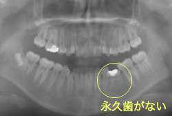 先天性欠如とは生まれつき永久歯が部分的に欠如している状態をいいます。一般的に下顎前歯や小臼歯が欠如していることが多いです。