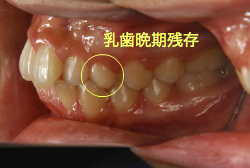 「乳歯が生え替わらない」という主訴で来院したケースです。 診断の結果、「左上永久犬歯が第一小臼歯後方上部に埋伏しているため、左上乳犬歯が晩期残存している症例」と判明しました。