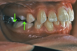 矯正歯科医が着目するのは、奥歯の噛み合わせの位置関係です。前歯の位置にそれなりの差が生じていても、奥歯の位置が正しければそれほど重症という評価にはなりません。このケースの場合は、上下の第一大臼歯の位置関係は、直線的に一致しているタイプでした(矢印が一致)。混合歯列時期の奥歯の位置関係としては、ほぼ正常な状態といえますが、症状から言うと、上の奥歯をもっと後ろに下げてやることができれば、上顎歯列全体に余裕ができるので、凸凹も解消できるし、前歯の傾きを内向きに修正することもできると考えられました。しかしこのまま全体に永久歯が生えきってしまうと、上の前歯が出たままになってしまいますので、生え替わりが完了する前に大急ぎで奥歯を後ろに下げる必要があると判断しました。