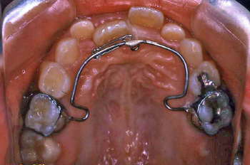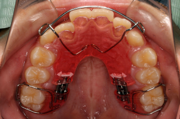 | 目的 | 「歯列全体を拡大する装置」です。上下歯列のどちらが小さい場合に、歯列全体を拡大するときに使う装置です。床矯正装置と違い取り外しができませんが、確実に拡大することができます。通常上顎に用いますが、下顎に適用することも可能です。デザイン次第で片側を拡大することもできます。この装置は、骨の土台ごと拡大するものではなく、あくまでも歯の配列を拡大するために使います。骨の土台ごと拡大するためには、「急速拡大装置」という特殊な装置が必要です。 |