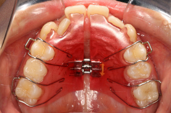 写真の方の場合、1日1回装置の中央にある拡大ネジを、ご自身で回して頂くことで25日間くらいかけて、6mmほど拡大しました。拡大後は、上顎の前歯の隙間が広がっていることがお分かりいただけると思うのですが、土台の骨ごと広がるのでこのような隙間ができます。その後1年半くらいマルチブラケット装置を使用して、全体の修正を行いました。 |