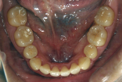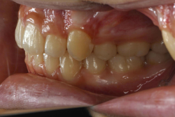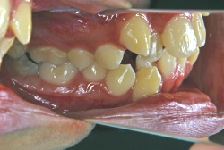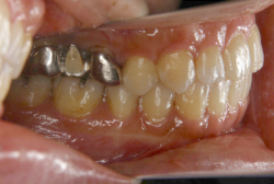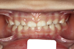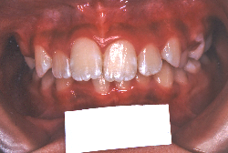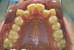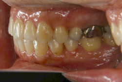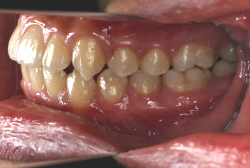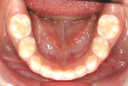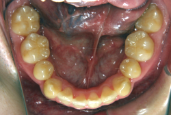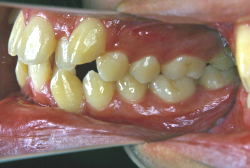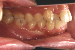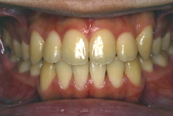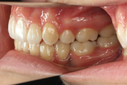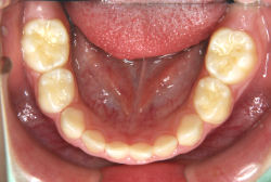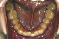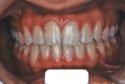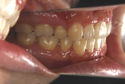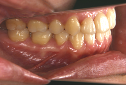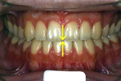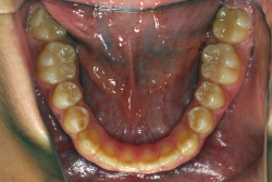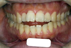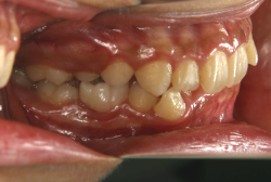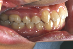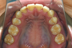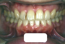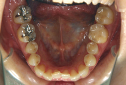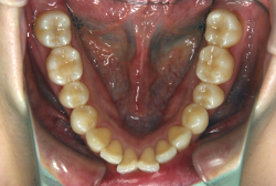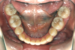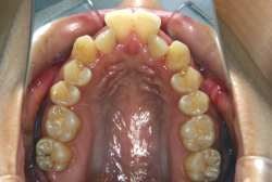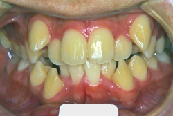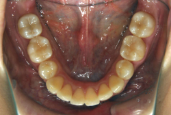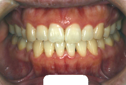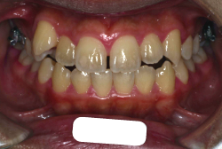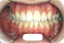 しかし、それ以上に問題なのは「前歯の噛み合い方が深すぎる」という症状で、初診の歯の正面写真を見ると下の前歯が全く見えません。こういう症状を矯正学では「過蓋咬合(かがいこうごう)」と言います。過蓋咬合を放置すると、将来的に顎関節に悪影響を与えるとされており、顎関節症の原因因子の一つです。また下の前歯の先端が、上の前歯の裏側の歯茎と強く接触するため、歯周病の原因にもなります。