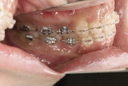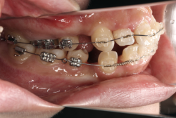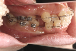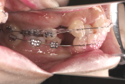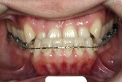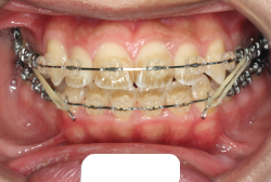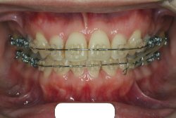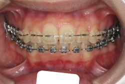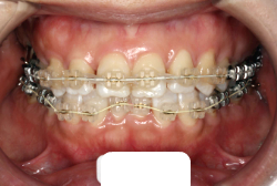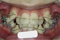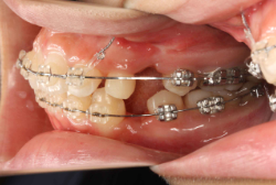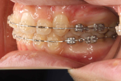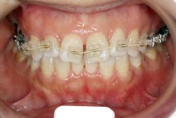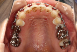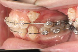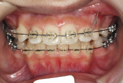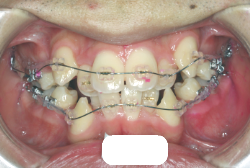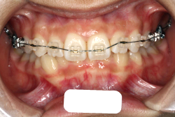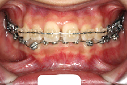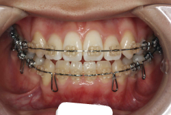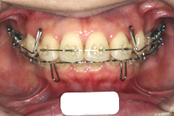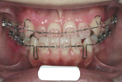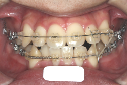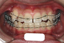 マルチブラケット装置は、装置装着時より数日から2週間程度強い不快感・疼痛が有りますが、本症例場合は治療後半で上顎前歯を内側へ牽引する際にも、強い疼痛が出ることがあります。
