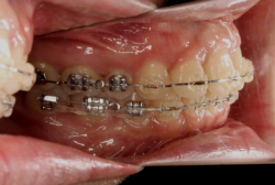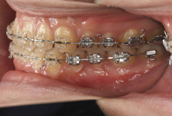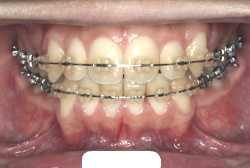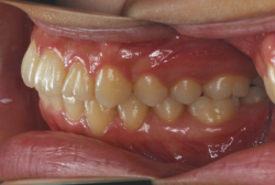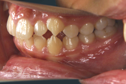 初診時と違い、上の奥歯がより後方に下がっていることが分かります。ただしこの段階では奥歯は後ろに下がりすぎの状態です。しかし次の段階でマルチブラケット法を始めると、上の奥歯は次第に前にズレて来ます。最終段階で正しい位置にするためには、この段階では余分に後ろに下がっている必要があります。