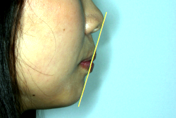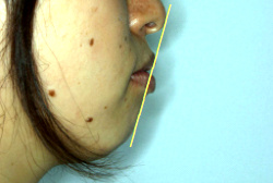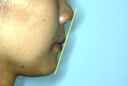 「出っ歯を治したい」という主訴で来院したケースです。診断の結果、「2級1類の上顎前突+軽度叢生」と判明しました。2級というのは、基本的に出っ歯の噛み合わせになっていることを言います。その中でも上の前歯が著しく外に反っているケースを、「1類」といいます。初診時の横向きの写真を見ると、それがはっきり分かります。上の前歯に押されて唇も膨らんで、審美線をかなりオーバーしています(審美線とは、鼻の先端と顎の先端を結ぶ線のことで、この線よりも唇は内側にある方が良いとされています)。