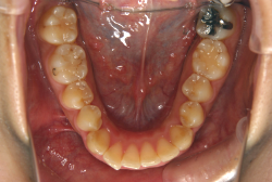 本症例では、逆転している前歯の重なりを出来るだけ短期間で解消する必要があります。そこでまず下の前歯を内側へ入れる準備を進め、その後、上の前歯を外へ出すのと同時に下の歯を内側に入れる治療をします。この治療段階では上下前歯が非常に強く当たらざるを得ない時期があり、このような衝撃の強い噛み合わせは(咬合性外傷と言います)、歯の破折、歯根吸収、歯肉退縮などを引き起こす可能性があります。そこで、この期間を最短で済ませるために上下で開始時期をずらしたりいろいろな工夫が必要となります。