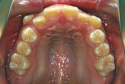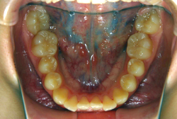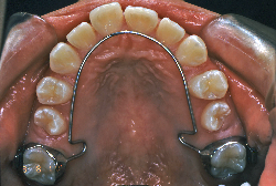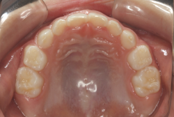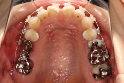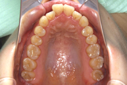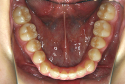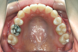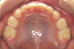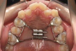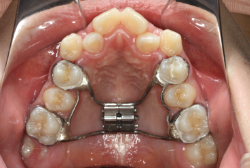 上顎に強い狭窄がある混合歯列期から18歳くらいまでの患者様に対して、本症例のように上顎急速拡大を行うことがあります。この装置は顎整形力に近い強力な力を口蓋に適用し、左右の口蓋骨を縫合部より強制的に乖離させることで上顎骨そのものを大きくする療法です。一時的に骨が離開するため顔面中央部に強い違和感、鼻腔奥の痛みを生じます。