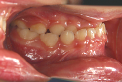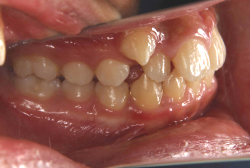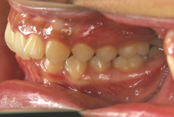 上顎前方牽引装置で3歳から4歳にかけて治療した一例です。早ければ6ヶ月くらいで、上の歯が外側に来た状態で噛めるようになります。この装置は、上顎の発育を助け、下顎の発育を抑制する効果があるので、上顎骨の発育不良を伴うケースに最も効果的です。