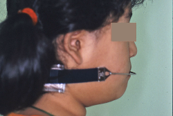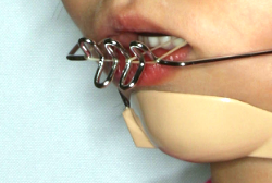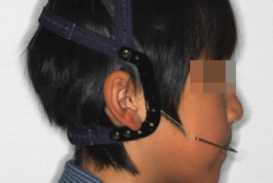 こういう症状でもっとも効果があるのが、顎外固定装置と言って、お口の外部から奥歯に力をかける方法です。 写真の装置はネックバンドというタイプの装置です。この装置は取り外し式ですので、夜寝るときに毎日自分で取り付けて、寝ている間に少しずつ上の奥歯を後ろに下げていきます。この装置には、奥歯を後ろに下げる効果だけでなく、上顎の過剰な成長発育の抑制、下顎の成長促進作用があるとされており、上顎前突の症状にはいずれも有利な効果が期待できます。