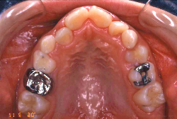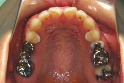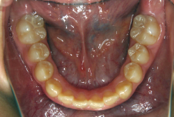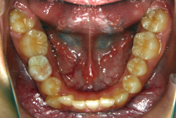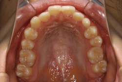 ネックバンドを1年半使用して、上顎大臼歯が十分後ろに下がったところで、裏側にリンガルアーチという固定のワイヤーを取り付けて、新しく生じた隙間が狭くならないよう「保隙(ほげき)」という処置をして、永久歯が生えそろうまで待機中の様子です。配列全体に隙間が生じているのがお分かりいただけると思います。これだけの隙間が確保できていれば、抜歯をしなくても、あとで上の前歯を内側に理想的な角度で引っ込めることができます。このように完全に永久歯列になる前に、十分な隙間が確保できるかどうかが、非抜歯で矯正できるかどうかの分かれ目になります。