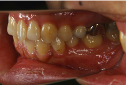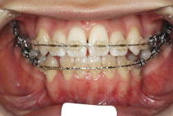 マルチブラケット装置は、装置装着時より数日から2週間程度強い不快感疼痛が有りますが、本症例場合は治療後半で上下顎前歯を内側へ牽引する際にも、強い疼痛が出ることがあります。