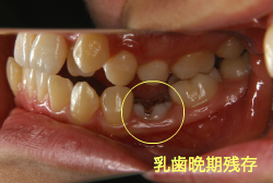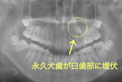 「乳歯が生え替わらない」という主訴で来院したケースです。 診断の結果、「左上永久犬歯が第一小臼歯後方上部に埋伏しているため、左上乳犬歯が晩期残存している症例」と判明しました。