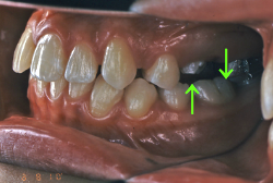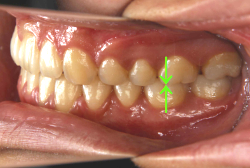 深く咬みすぎると、歯と歯で接触しながら閉じる距離と面積が広範囲にわたりすぎ、必要以上に歯をすり減らします。また顎の関節の自由な動きを歯と歯の接触関係が必要以上に規制してしまうため、顎の関節の動きがだんだん悪くなり、顎が開きにくくなったり、開いていく途中で大きな音が出たり、ひどいときには途中からそれ以上開けなくなったりします。こういう症状を"顎関節症"と言いますが、こういう状態にもっともなり易い咬み合わせです。顎関節症は、中年期以上にある日突然症状が発現することが多く、一度発症するとなかなか健康な状態にならない、消耗性の病気です。若くて抵抗力のあるうちはまだ良いのですが、過蓋咬合の人は歯がすり減りやすく、時間の経過とともに、ますます咬み合わせが深くなっていく傾向があり、早期発見・早期治療が望まれます。