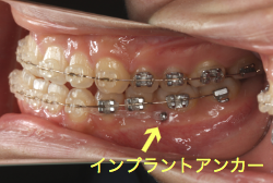 今回の患者様の場合は、「外科」も「小臼歯抜歯」も拒否されましたので、歯科矯正用アンカースクリュー(以下 アンカースクリュー)を用いて、下顎の歯列全体を後方に下げるという方法を取りました。